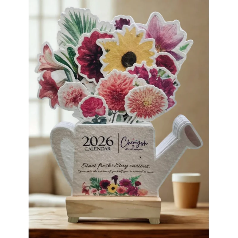 A handcrafted 2026 desk calendar shaped like a flower bouquet, featuring real floral photographs captured inside the IIM Bangalore campus. Printed on plantable seed paper, it transforms into plants after the year ends. Thoughtful, elegant, and eco-friendly.